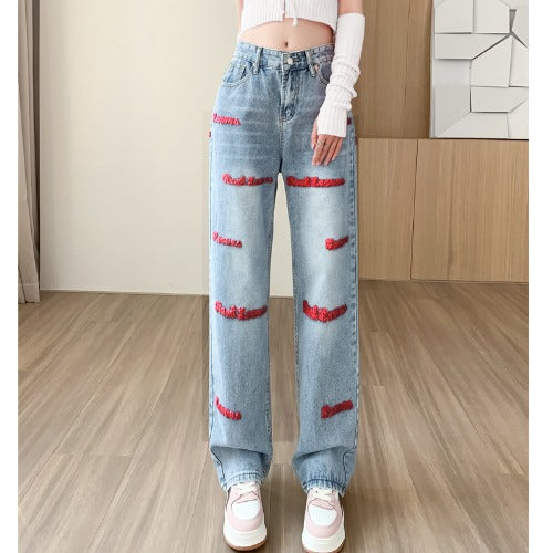 Women's Wide-leg Jeans Embroidered Letters Straight-leg Pants
