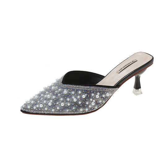 Women's Fashion Pointed Stiletto Heel Full Diamond Pearl Slippers