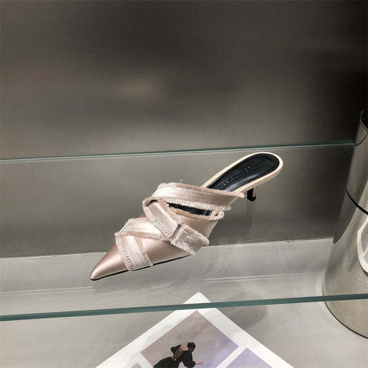 Elegant Pointed Toe Spring And Summer Light Satin Sandals Cross Strap Kitten Women's High Heels