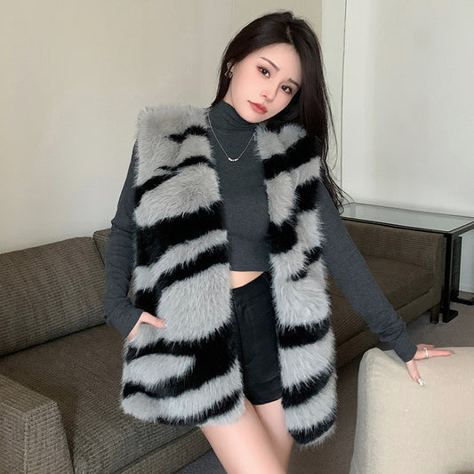 Zebra Pattern Female Temperament Environmental Protection Fur Fried Street Vest Coat