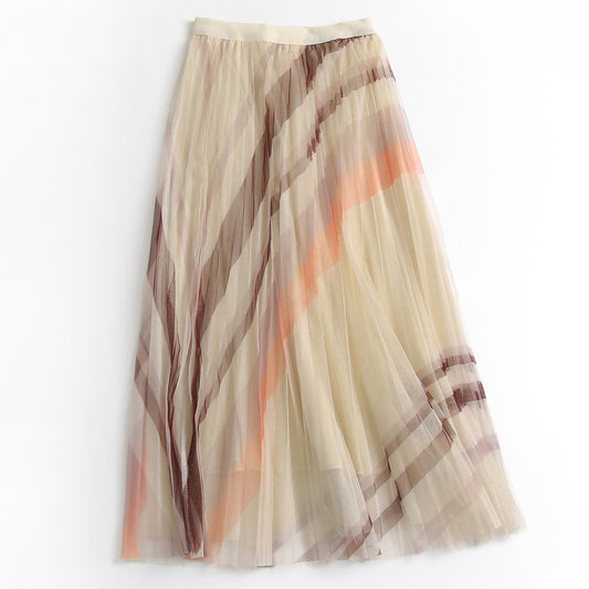 Women's Striped Elastic Waist Slim Fit Mesh Pleated Skirt